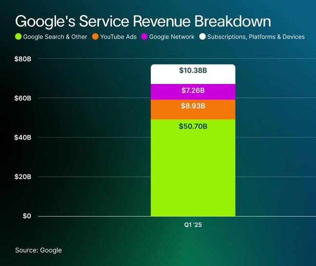 This image shows Google's Q3 2023 earnings, with $76.7 billion in revenue. Key contributors are search, YouTube, Google Play, and Google Cloud, with ad revenue being the largest at $59.6 billion. Google’s net profit is $19.7 billion (26% margin), whi