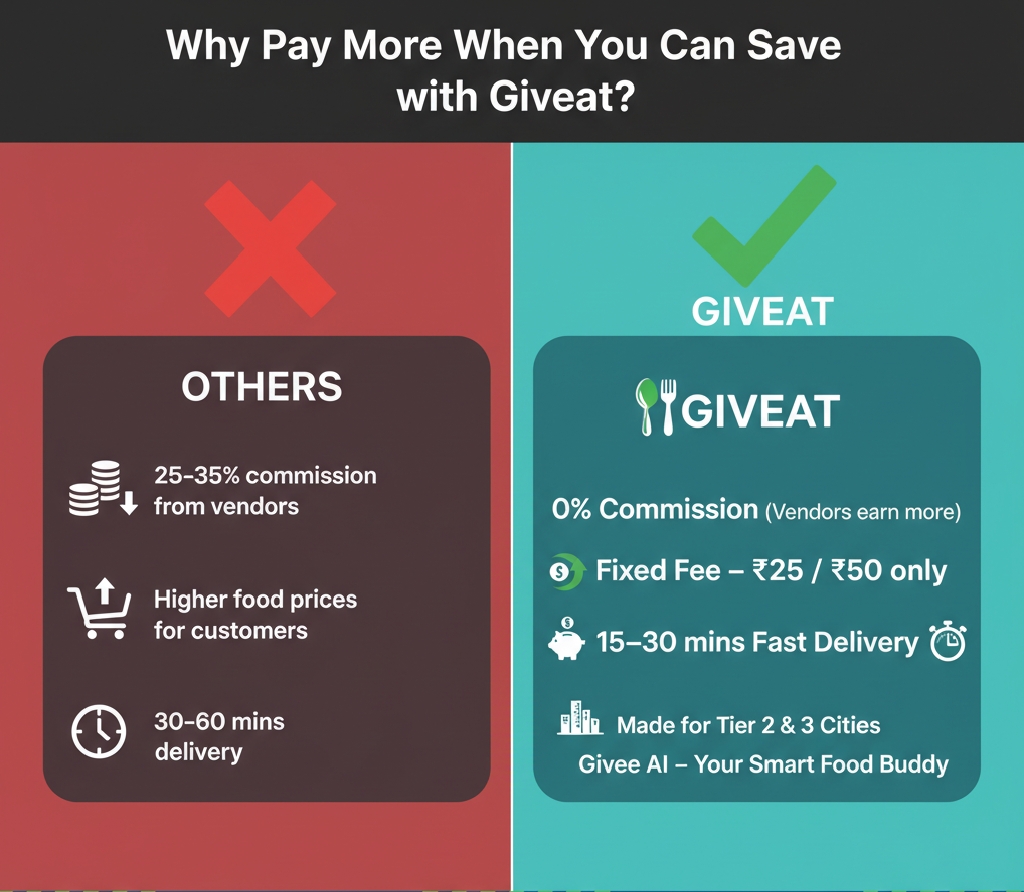 Giveat vs Other Food Delivery Platforms – What Makes Us Different? When we started Giveat, we saw 3 big problems in the food delivery space: 1️⃣ Customers paying high prices (because of 20–35% commissions) 2️⃣ Vendors losing profit margins 3️⃣ Small