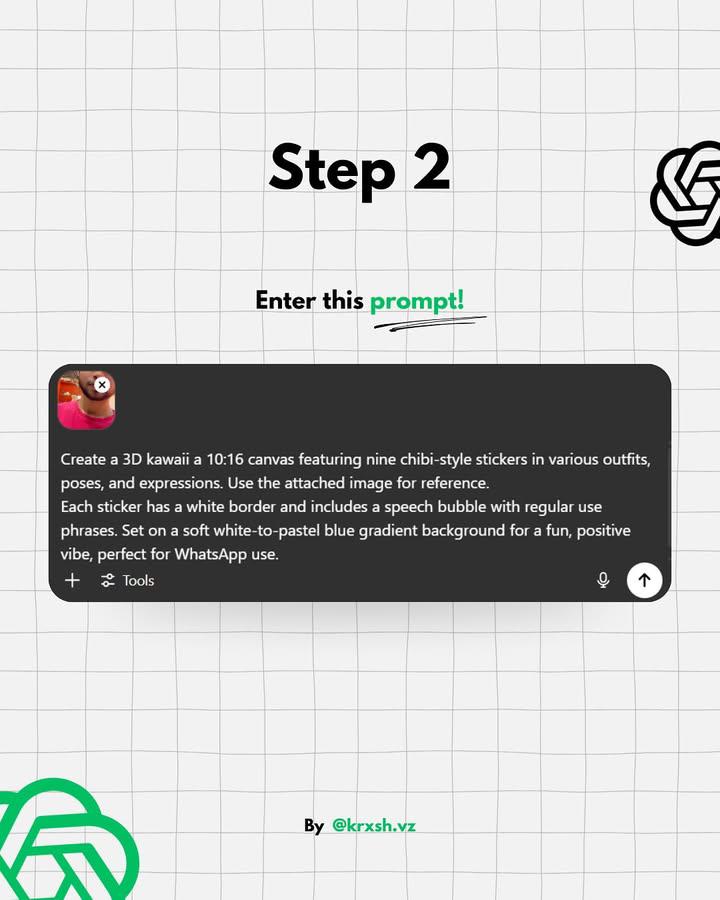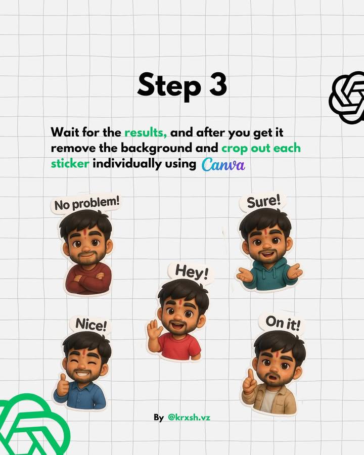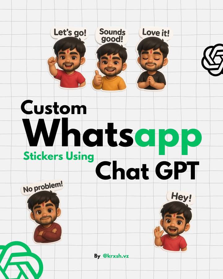 You can now create custom WhatsApp stickers using ChatGPT. No design skills. No complex tools. Just your imagination + the right prompts. Here’s how simple the process is: → Add your reference image→ Enter the prompt→ Get your stickers ready in seconds→ (Optional) Use Canva to remove the background AI is making creativity this easy now.