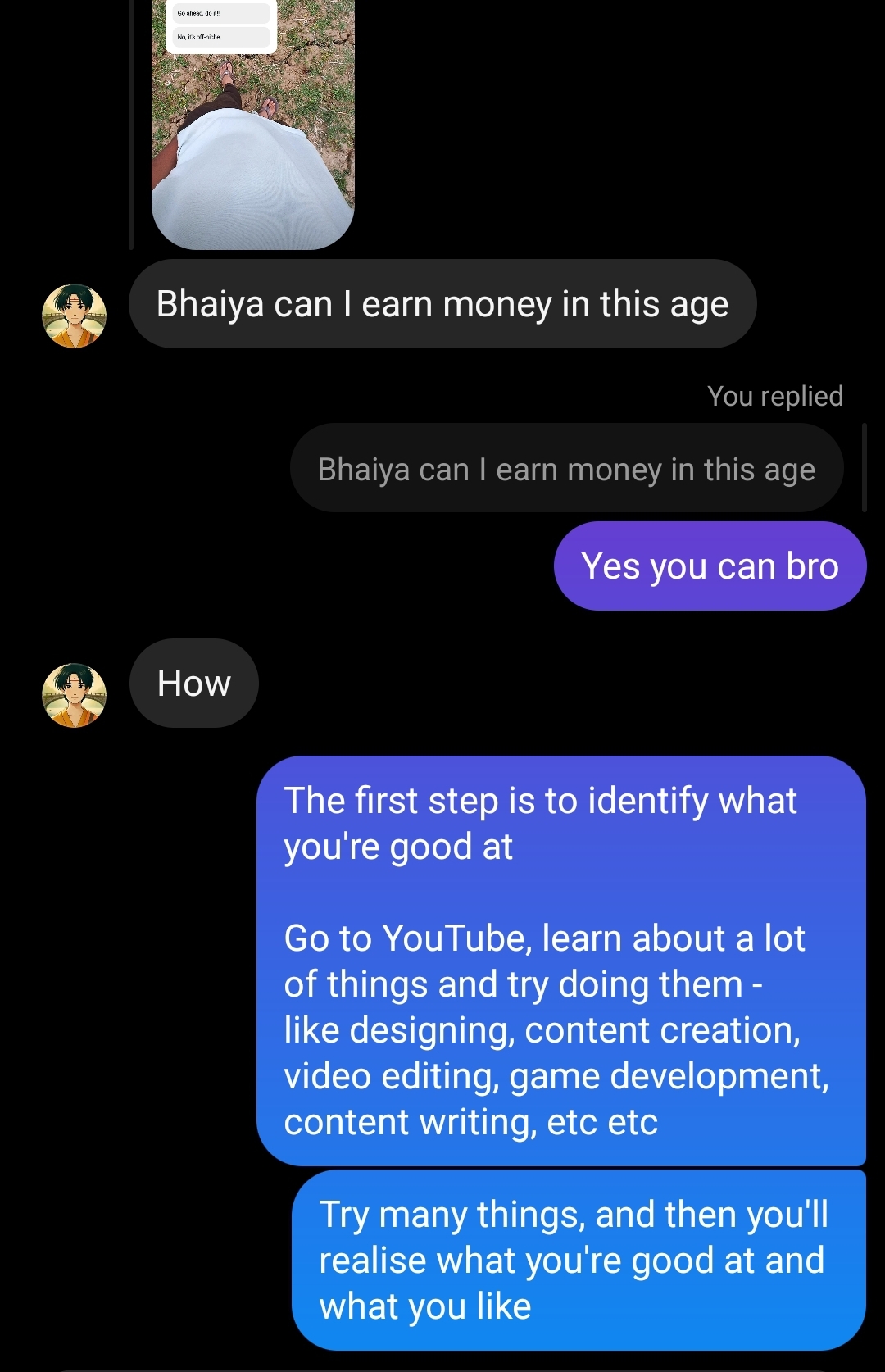 "Bhaiya can I earn money in this age" a junior asked innocently... and my helper-ego woke up again I gave him a brief explanation of how to earn money... but the most important thing I told him was "explore a lot of things and find out what you'