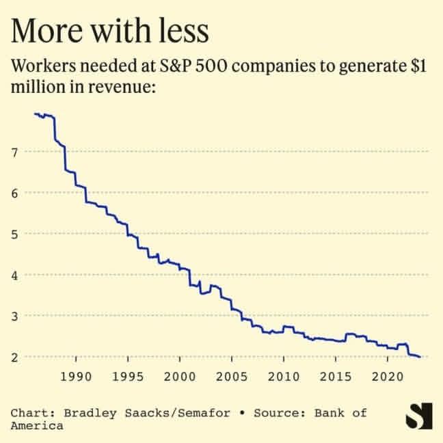 AI will be coming for your job. There’s no secret about that. 📉 This chart shows how S&P 500 companies went from needing 7 workers to just 2 to generate $1M in revenue. It’s not just automation—it’s a paradigm shift. Here’s what’s coming: By 2030, 30% of white-collar jobs will be fundamentally changed by AI. Just last week, OpenAI launched Codex—an AI agent that can code entire applications by itself. This isn’t about the future. It’s already happening.So what does this mean for you? Here are 5 survival strategies for the AI job tsunami—and how to turn the tide in your favour 👇 1. UBI is coming. Companies gaining billions in productivity with fewer staff may be taxed differently—on profit, not payroll. This could fund UBI (Universal Basic Income) to support displaced knowledge workers. 2. The rise of 1-person, AI-powered companies The chart tells the story: 1980s = 8 employees per $1M Today = 2 employees per $1M Soon: 1 founder + 10 AI agents running a full-stack business. No staff, no limits. 3. The Great Demonetization is next. AI will slash costs across the board: 🩺 Healthcare 🎓 Education 🧠 Therapy 👶 Childcare Lower living costs = New economic model. Job loss ≠ lifestyle loss. 4. Find your MTP (Massive Transformative Purpose) AI is replacing roles—not purpose. Those who create value beyond what AI can replicate will win. Stop asking, “What job should I get?” Start asking, “What problem do I want to solve?” 5. Curiosity is your career insurance In an AI-first world, the most valuable skill is the ability to learn fast. 🧠 Don’t hoard knowledge. ❓ Ask better questions. 🔁 Adapt relentlessly. The curious will own the future.