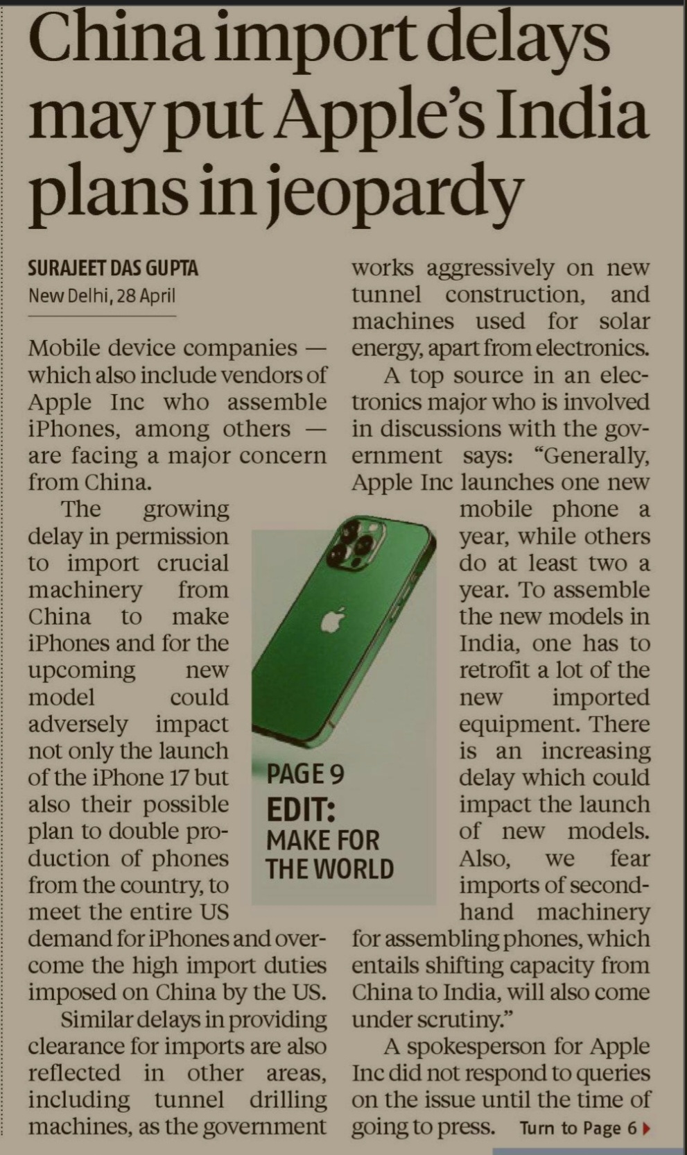 "iPhone Dreams Stuck at the BorderโAppleโs India Plans Waiting for a 'Hello' from Customs!" Appleโs India dream just hit a red lightโand itโs stamped โMade in China.โ With crucial iPhone-making machinery stuck in import limbo, the iPhone 17 might be