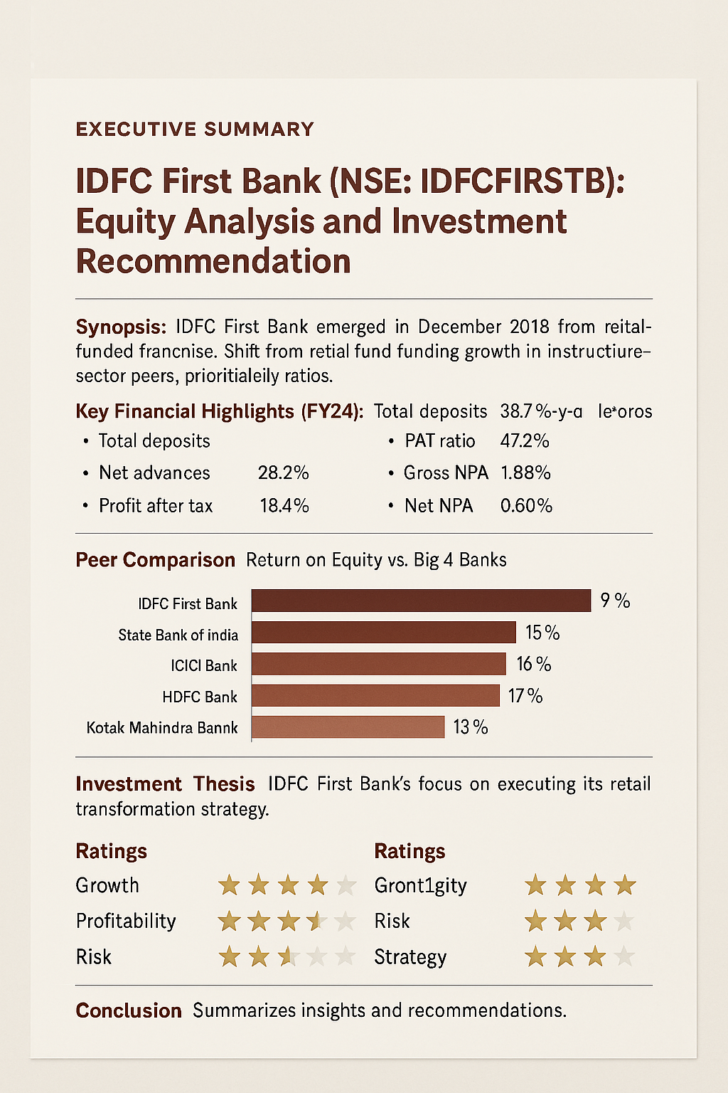 "Fresh insights on IDFC First Bank (NSE: IDFCFIRSTB): Strong FY24 growth but ROE still behind top banks. Retail transformation strategy in focus. Check the executive summary below. #IDFCFirst #BankingSector #EquityResearch #IndiaInvests"