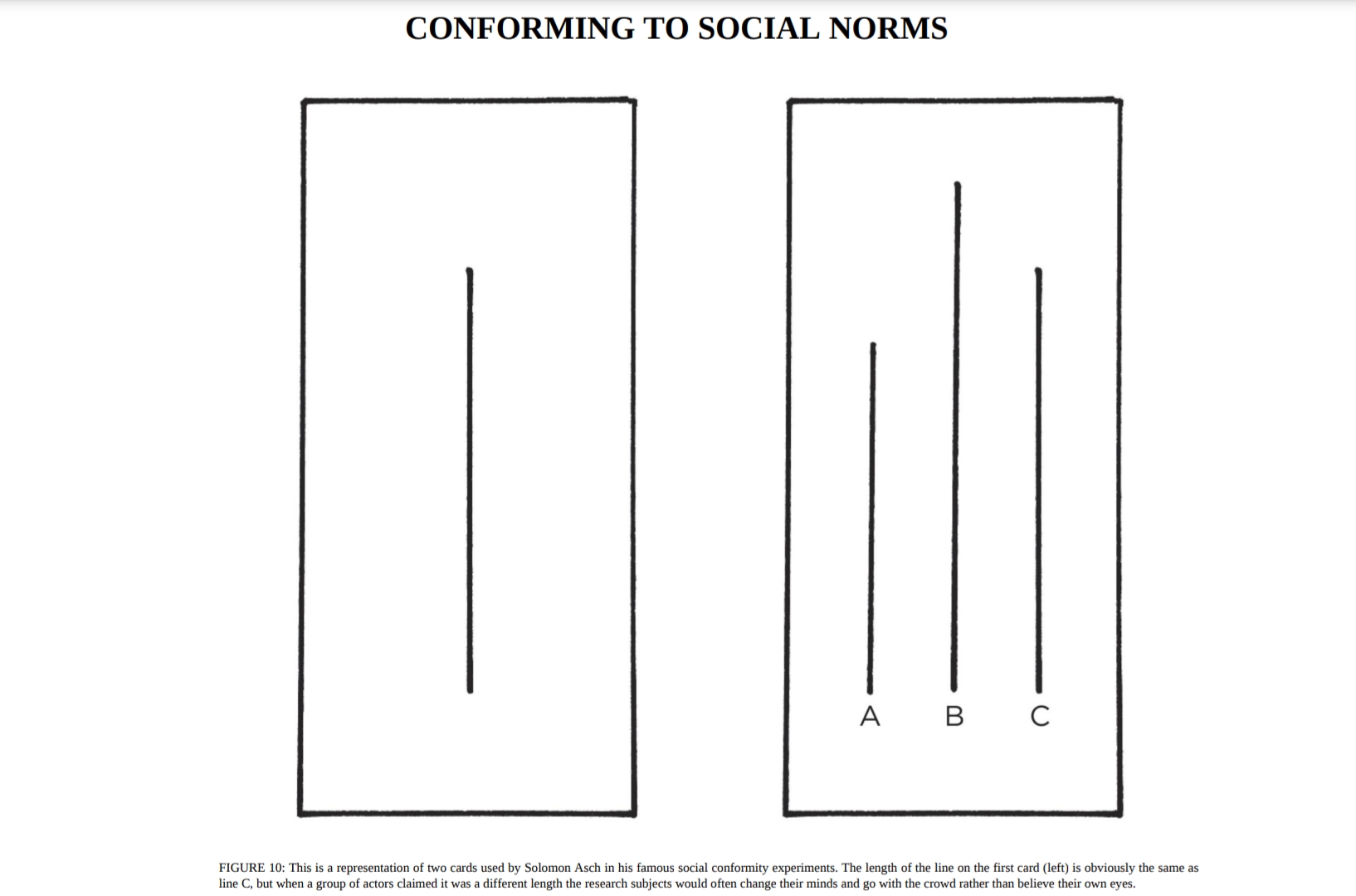Even when they know they are incorrect, people have a tendency to follow the ideas of others. According to Solomon Asch's tests, people were more prone to follow the herd and doubt themselves as the size of the group grew. Although this inclination a