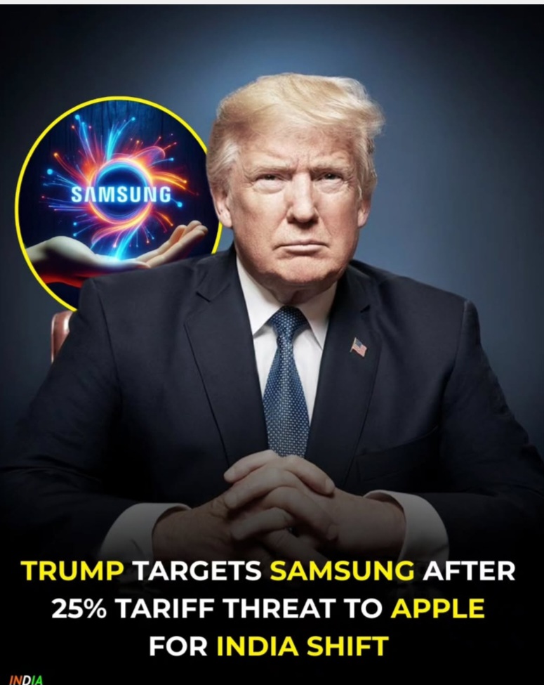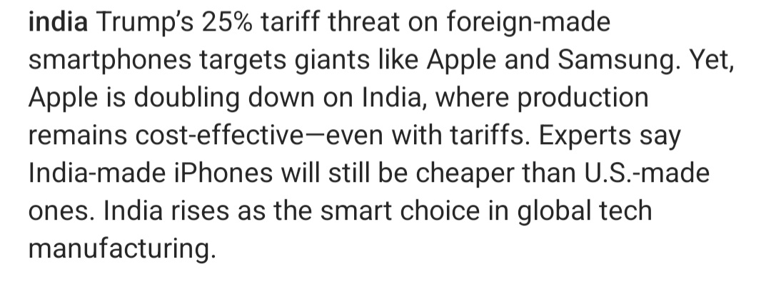 The image presents a text-based article discussing the impact of Trump's 25% tariff threat on foreign-made smartphones, particularly on tech giants like Apple and Samsung.