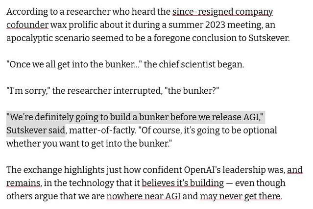 OpenAI's chief scientist said they're going to hide in a bunker when they release AGI. AI company CEOs have admitted AI poses a risk of extinction to humanity. They know that what they're doing is incredibly dangerous, but push ahead regardless.