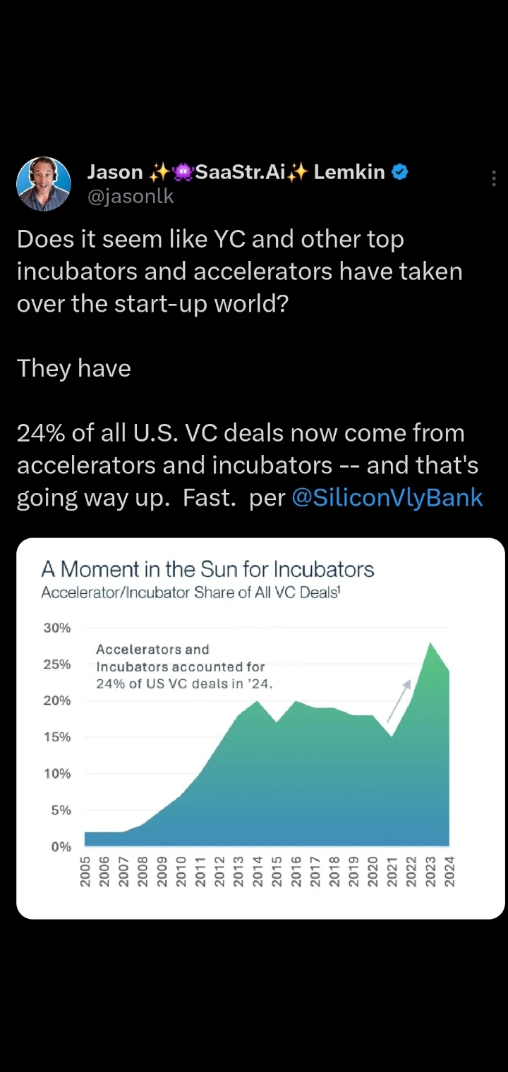 ๐ฆ๐๐ฎ๐ฟ๐๐๐ฝ๐ ๐๐๐ฒ๐ฑ ๐๐ผ ๐ฐ๐ต๐ฎ๐๐ฒ ๐ฉ๐๐. Now? They chase accelerators first. In 2024, ๐๐% ๐จ๐ ๐๐ฅ๐ฅ ๐.๐. ๐๐ ๐๐๐๐ฅ๐ฌ came from ๐ข๐ง๐๐ฎ๐๐๐ญ๐จ๐ซ๐ฌ ๐๐ง๐ ๐๐๐๐๐ฅ๐๐ซ๐๐ญ๐จ๐ซ๐ฌ like YC. That's nearly ๐ ๐ข๐ง ๐ ๐๐ ๐๐๐๐ฅ๐ฌ โ and itโs accelerating fast. A decade ago, this was under 5%. Today, accelerators are the new gatekeepers of innovation. They provide: โขEarly validation โขAccess to elite networks โขInstant credibility for follow-on funding YC, Techstars, and others arenโt just support systems anymore โ theyโre power centers. ๐๐ผ๐ป๐ฐ๐น๐๐๐ถ๐ผ๐ป: If you're building in 2025, the path to VC isnโt just pitch decks. It's proving yourself through an accelerator first. Startups don't just launch now. They graduate.