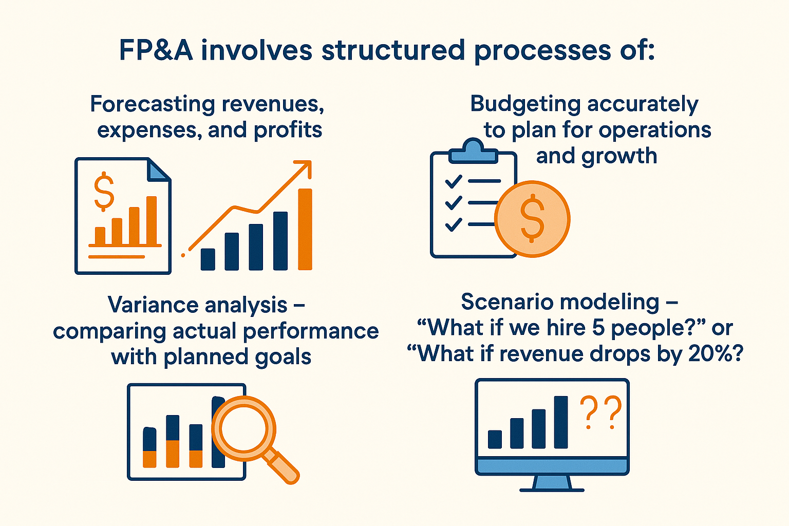 🔴 90% of startups fail. But do you know why? Not because of bad products. Not because of lack of demand. But because they run out of cash and make poor financial decisions. 💡 That’s where Financial Planning & Analysis (FP&A) steps in — and becomes your startup’s secret weapon. 🚀 What is FP&A? FP&A is the process of using financial data to plan, analyze, and support better decision-making. It includes: 📊 Budgeting & Forecasting 📊 Cash Flow Planning 📊 Scenario Analysis 📊 Performance Tracking 📊 Strategic Financial Modeling In simple words: It helps you know where your money is going, and where it should go. 📌 Why FP&A is Critical in Early-Stage Startups 💸 1. Control Your Burn Rate Most startups burn $10K–$100K/month. Without FP&A, you won’t know: How long your runway is What costs can be optimized When you’ll need the next funding round With FP&A: You can forecast runway down to the week, and plan 6–12 months ahead. 🔁 2. Track ROI on Every Spend Whether it’s hiring, ads, or tools — FP&A helps you calculate: Cost vs. return of each action Break-even timelines Profit margins by product or service 💰 Know if spending ₹1 lakh on ads is actually giving you ₹1.5 lakh in return — or burning cash. 📉 3. Make Data-Driven Decisions, Not Gut Calls Imagine choosing between hiring a new sales lead or launching a new feature. FP&A helps you simulate both cases: What happens to revenue in 3 months? What’s the cash impact? Which one improves margin? 📅 4. Plan Fundraising Smartly Investors want numbers, not just vision. FP&A provides: 12–18 month financial projections Unit economics like CAC, LTV, Payback Period Clean dashboards that increase investor trust 🧠 5. Keep Your Team Aligned Everyone on your team knows the targets: Revenue = ₹5 Cr this year Monthly cost = < ₹3 lakh Growth = 10% MoM No more guessing. Just goals.