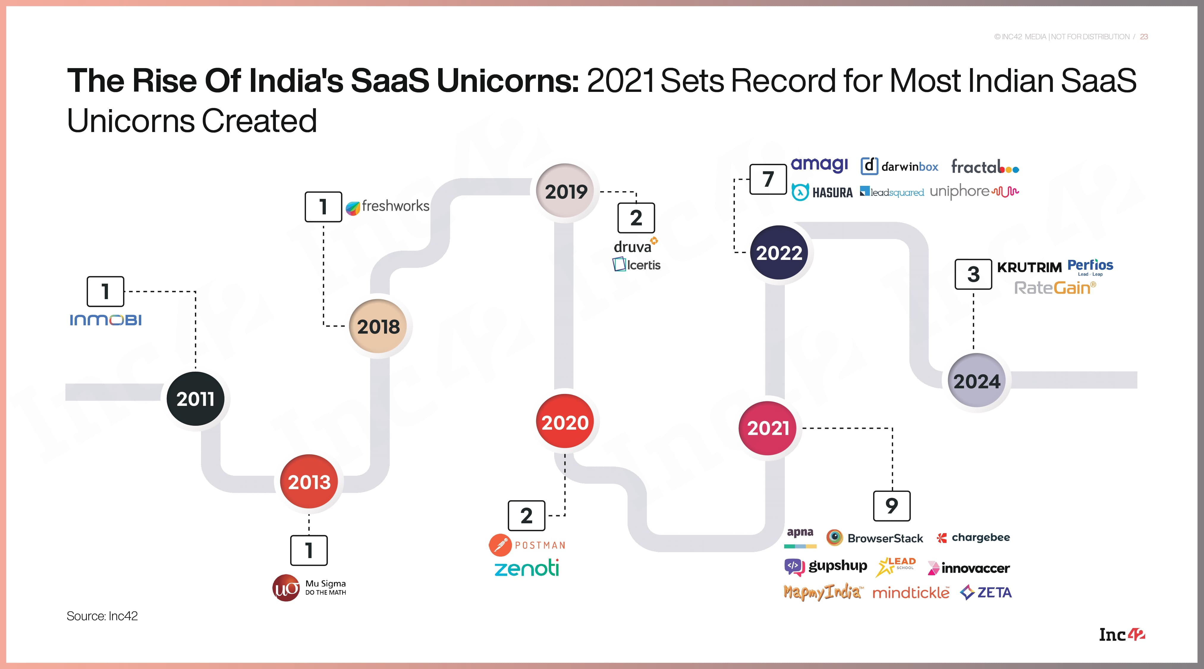 The rise of Indian SaaS Unicorns continues to break records! In 2021 alone, India saw the creation of 9 SaaS unicorns, marking the highest number yet. With more startups joining the elite club each year, India's SaaS industry is accelerating into a b