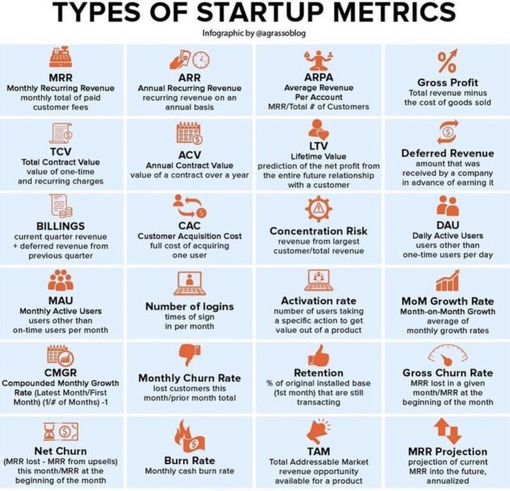 This infographic shows key startup metrics. MRR is monthly recurring revenue, while ARR is annual recurring revenue. ARPA shows average revenue per customer. Gross Profit is revenue minus costs. TCV and ACV measure contract values. LTV predicts total