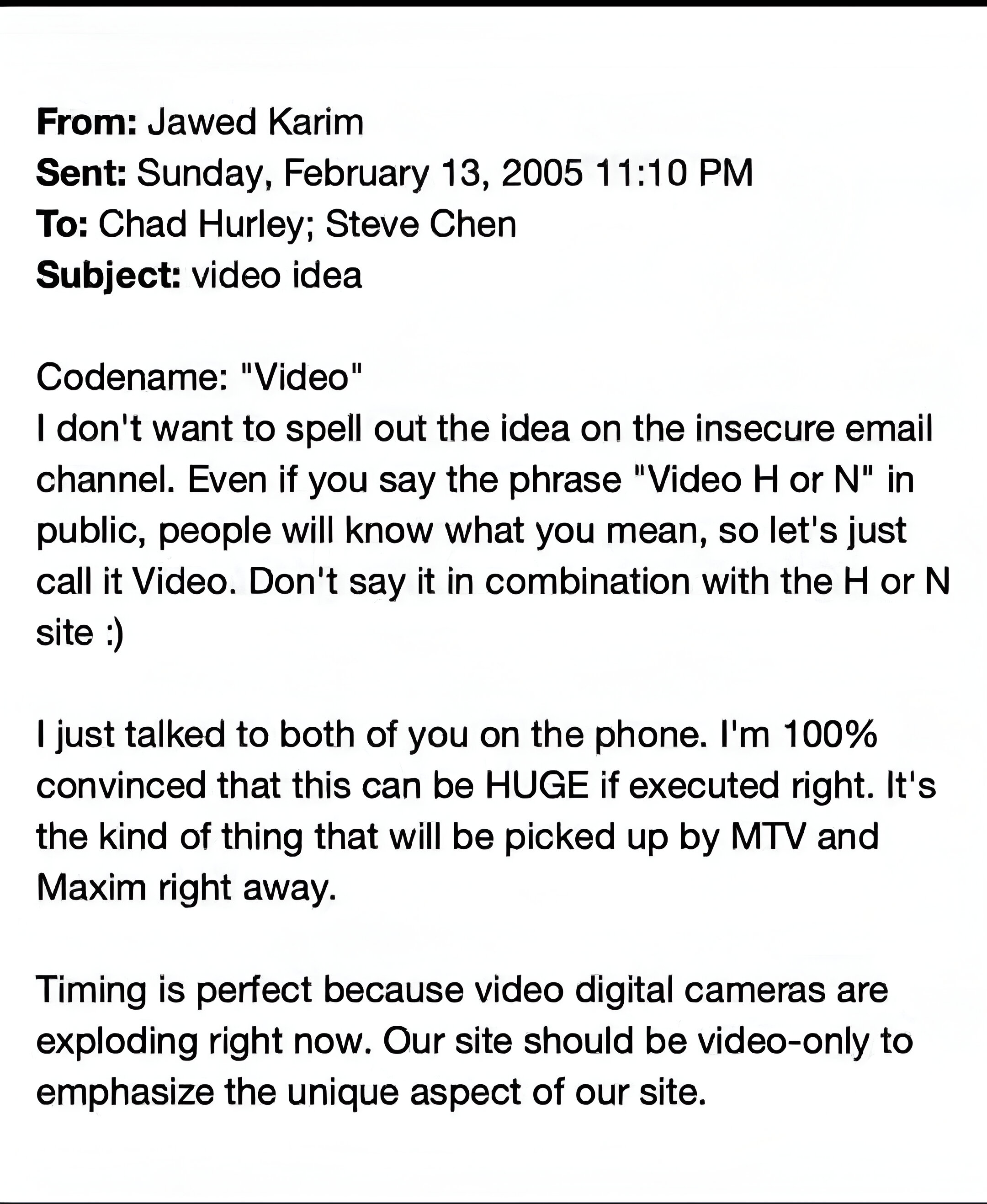 The Email That Changed the Internet: How a Simple Vision Became YouTube. ▶️ Jawed Karim's Visionary Email on a Video-Only Platform In 2005, YouTube co-founder Jawed Karim sent an email proposing a platform dedicated solely to video content. His id