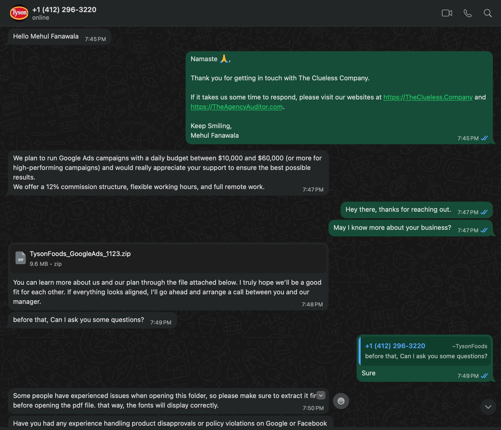 Scammers are upskilling. Are we? I recently received a WhatsApp message from someone claiming to represent Tyson Foods. The message sounded exciting, they were looking to run Google Ads campaigns with a daily budget of $10,000 to $60,000, offering 1