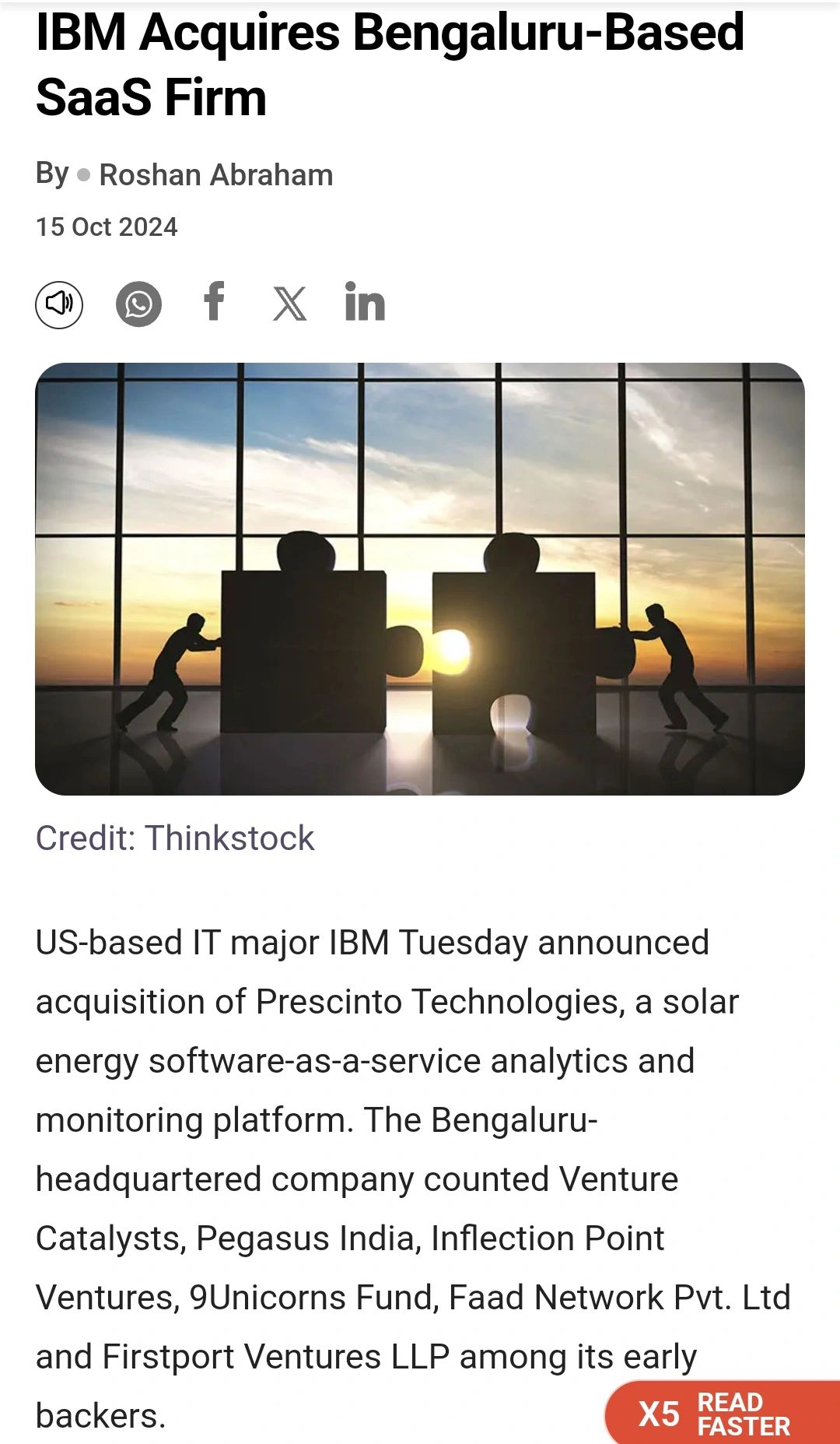 BIG NEWS!! 😍 I announce the acquisition of our portfolio company - Prescinto, by the software giant IBM. 🚀 Prescinto, an IBM Company uses Artificial Intelligence to identify causes of underperformance and suggest actions to improve generation in