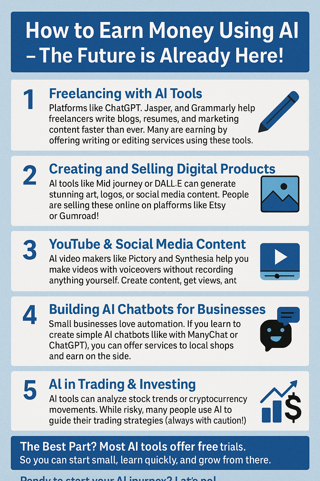 How to Earn Money Using AI – The Future is Already Here! Here are some smart ways people are using AI to make real income: 1. Freelancing with AI Tools Platforms like ChatGPT, Jasper, and Grammarly help freelancers write blogs, resumes, and marketi