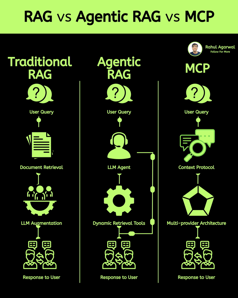 Simple explanation of Traditional RAG vs Agentic RAG vs MCP. 1. ๐ง๐ฟ๐ฎ๐ฑ๐ถ๐๐ถ๐ผ๐ป๐ฎ๐น ๐ฅ๐๐ (๐ฅ๐ฒ๐๐ฟ๐ถ๐ฒ๐๐ฎ๐น-๐๐๐ด๐บ๐ฒ๐ป๐๐ฒ๐ฑ ๐๐ฒ๐ป๐ฒ๐ฟ๐ฎ๐๐ถ๐ผ๐ป) โข ๐ฆ๐๐ฒ๐ฝ 1: ๐จ๐๐ฒ๐ฟ ๐ฎ๐๐ธ๐ ๐ฎ ๐พ๐๐ฒ๐๐๐ถ๐ผ๐ป. Example: โ๐๐ฉ๐ข๐ต ๐ช๐ด ๐ต๐ฉ๐ฆ ๐ค๐ข๐ฑ๐ช๏ฟฝ