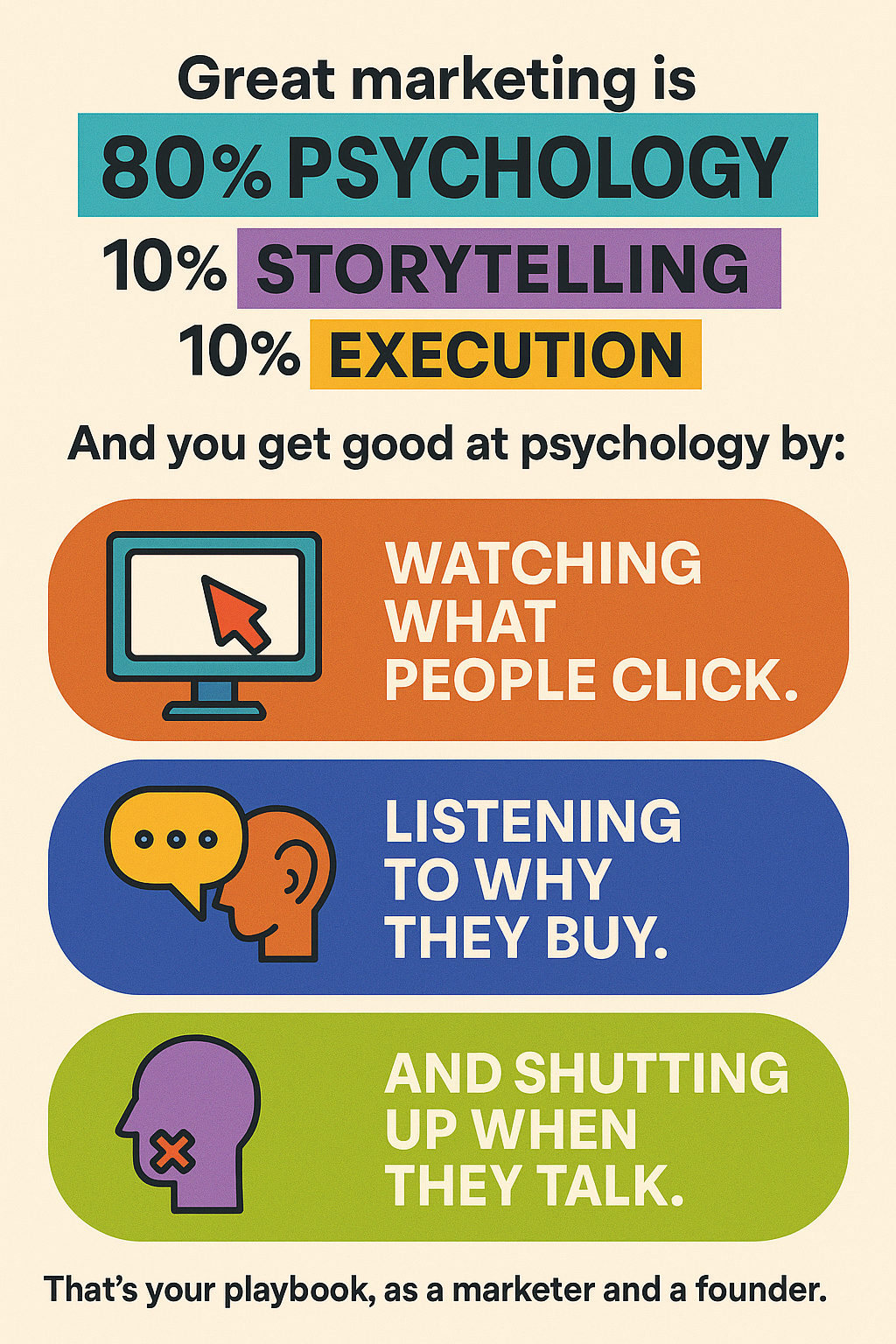 Great marketing is 80% psychology, 10% storytelling, 10% execution. And you get good at psychology by: -Watching what people click -Listening to why they buy -And shutting up when they talk That’s your playbook, as a marketer and a founder.