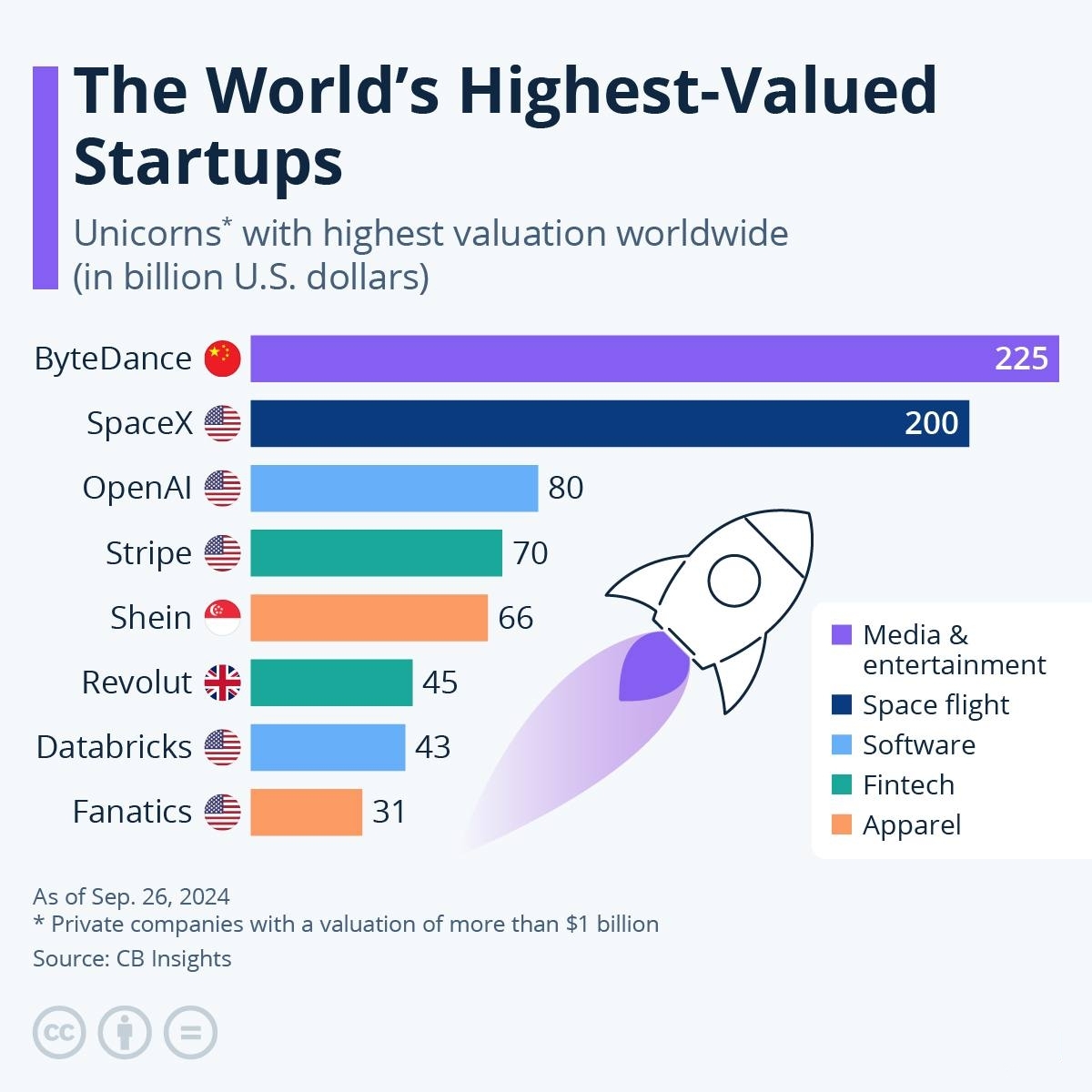 "🌟 Meet the Titans of Innovation! 🌍💼 From media and space flight to fintech and software, these unicorns are reshaping industries with massive valuations. With ByteDance leading at $225B and SpaceX at $200B, the race for global impact is heating