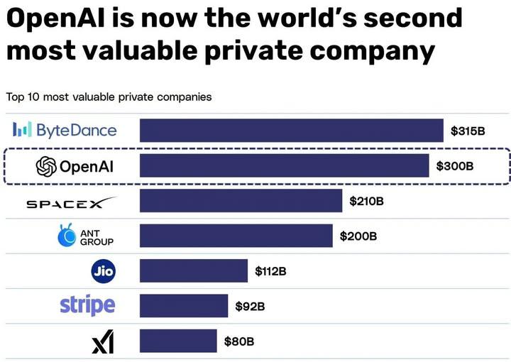 OpenAI is now the WORLD'S 2ND MOST VALUABLE private company at $300B 🚀🔥 Just $15B behind ByteDance 😳 and way ahead of SpaceX, Jio & Stripe! AI is officially the BIGGEST game-changer in tech history. At this pace, OpenAI might hit #1 by month-end.
