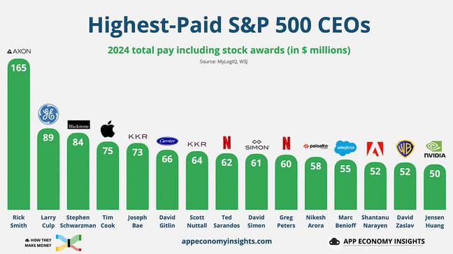 The highest-paid CEO of 2024 isn’t at NVIDIA, Apple, or Tesla. It’s Rick Smith, CEO of Axon — the taser company. He made $165M last year, 3x what Jensen Huang earned.