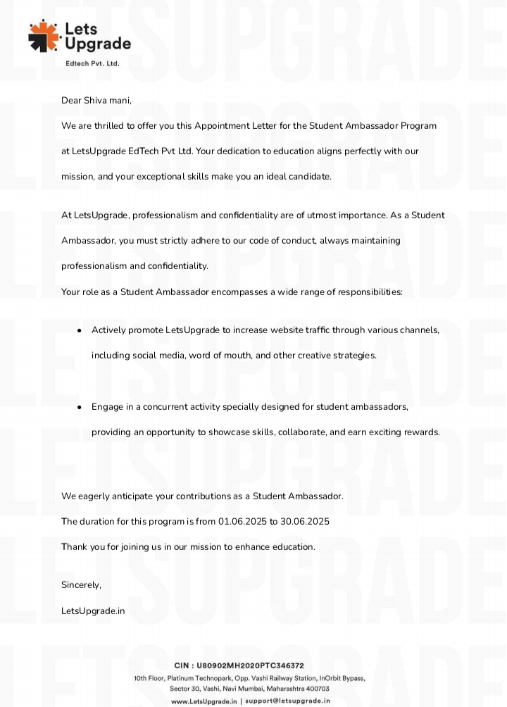 Thrilled to share that I've been selected as a Student Ambassador for @Let's Upgrade! ๐ I'm excited to represent this amazing platform and help fellow students unlock their potential through skill development and learning. ๐ค๐ป Let's Upgrade is committed to providing high-quality resources and opportunities, and I'm honored to be a part of this journey. ๐ If you're a student looking to upskill or reskill, let's connect and explore the possibilities together! ๐๐ก #StudentAmbassador #LetsUpgrade #SkillDevelopment #Learning