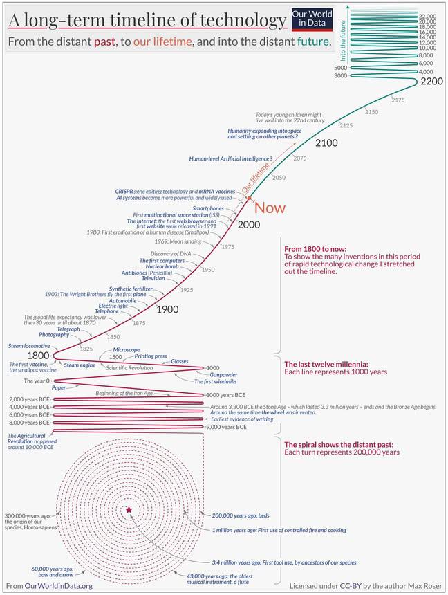 Humanity’s progress is accelerating insanely fast: Stone Age→Farming: 100,000 yrs Farming→Steam: 12,000 yrs Steam→AI: 200 yrs 2000-2014: 100 years of progress in 14. Moore’s Law predicted 32x. AI chips did 1000x.