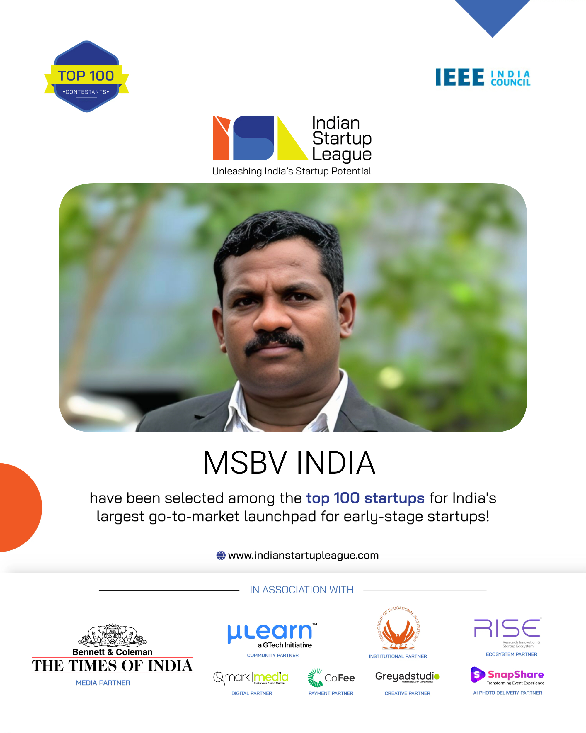 "The moment that gave me true happiness." Greetings from the Indian Startup League! We are thrilled to inform you that your startup MSBV INDIA PRIVATE LIMITEDโ has been selected among the Top 100 finalists of Indian Startup League 2025 โ one of Indiaโs most vibrant national startup summits, taking place on June 14, 2025, in Calicut. Congratulations on making it to this prestigious league of innovators!