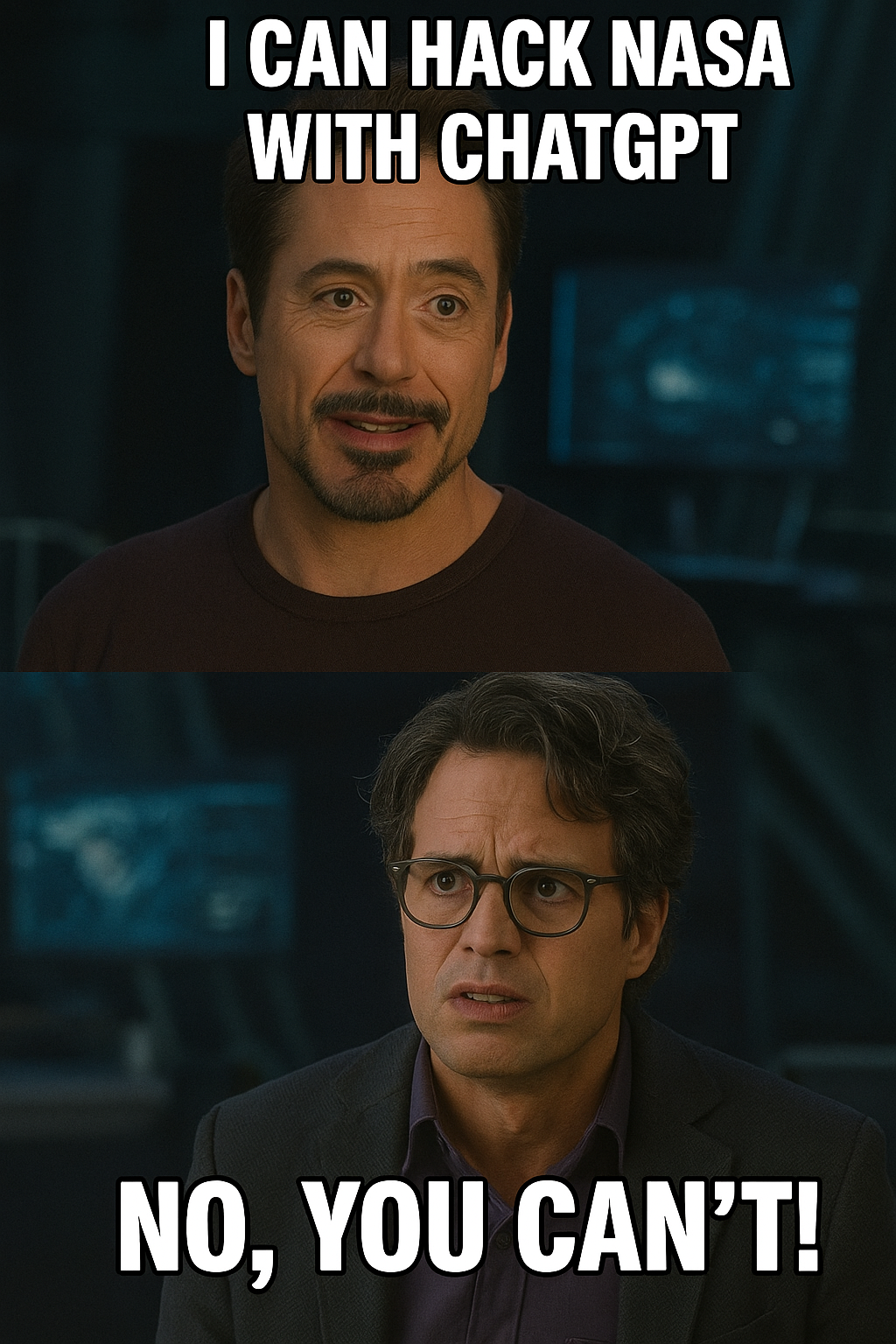 When you're too confident with ChatGPT and think you're the next Tony Stark... 💻🤖🛰️ Bruce Banner is all of us trying to keep things legal 😅 #AIHackersBeLike