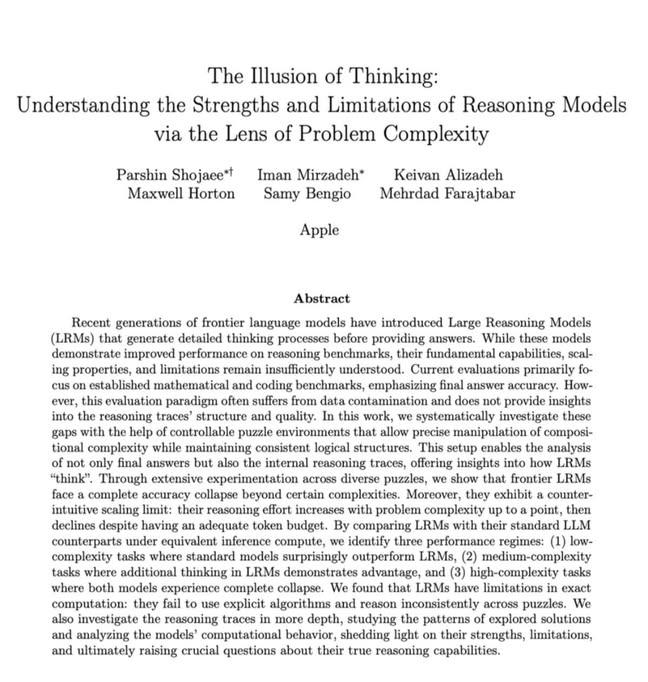 🧠🍏 Apple Just Dropped a Bomb on AI Reasoning, “The Illusion of Thinking” Apple’s latest research paper is making waves and not the usual “faster chip, better cam” kind. In The Illusion of Thinking, Apple’s AI team basically said: “Yeah… large la