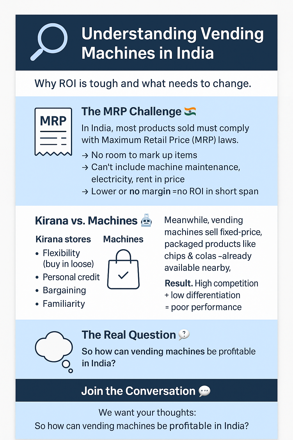 💬 Let’s Talk Vending Machines in India... Ever wondered why vending machines — so common in the West — haven’t really taken off in India? They sound perfect on paper: ✔️ 24×7 access ✔️ No staff needed ✔️ Hygienic, automated service ✔️ Fast and cas