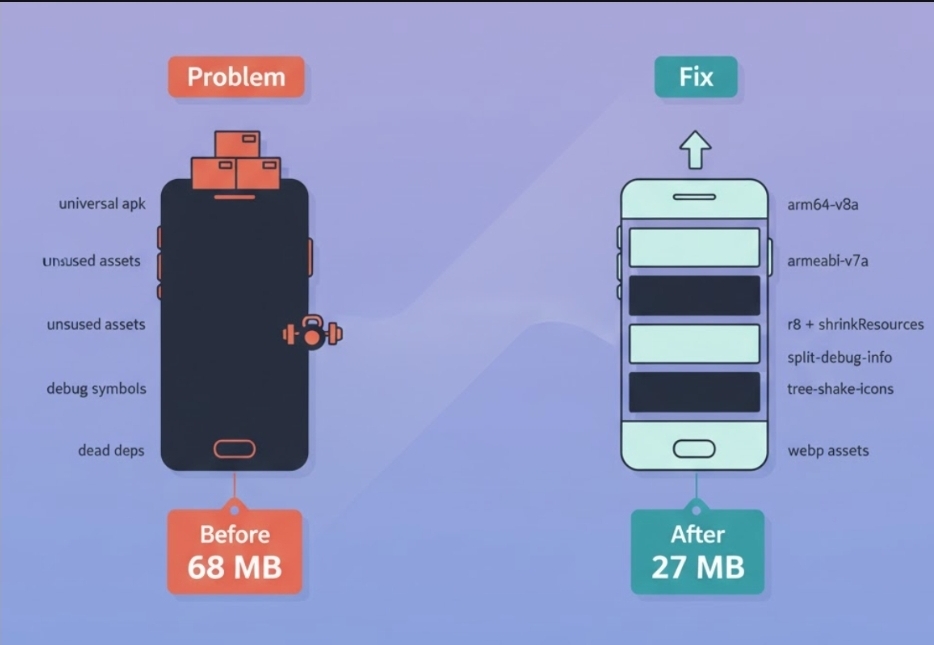 I Shrunk a Flutter Release From 68 MB to 27 MB With Every Feature Intact A lab-style teardown you can copy this afternoon: exact flags, Gradle switches, asset diet, and what actually moved the needle (Oct 22 2025) my release lit up a warning: “Larg