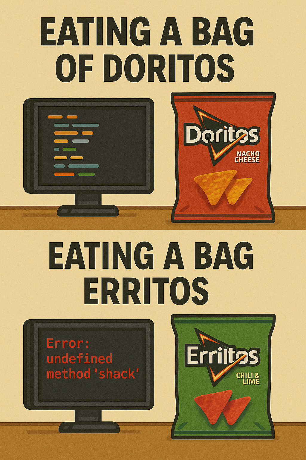 Eating Doritos: Writing clean code. Eating Erritos: Summoning 1000 errors you can't debug. #CodingLife #DebuggingStruggles #Error404BrainNotFound #ProgrammerProblems #SnackAndStack#Linux #like #share #findyou #zehrasec #infosec #hiring #hire #follow