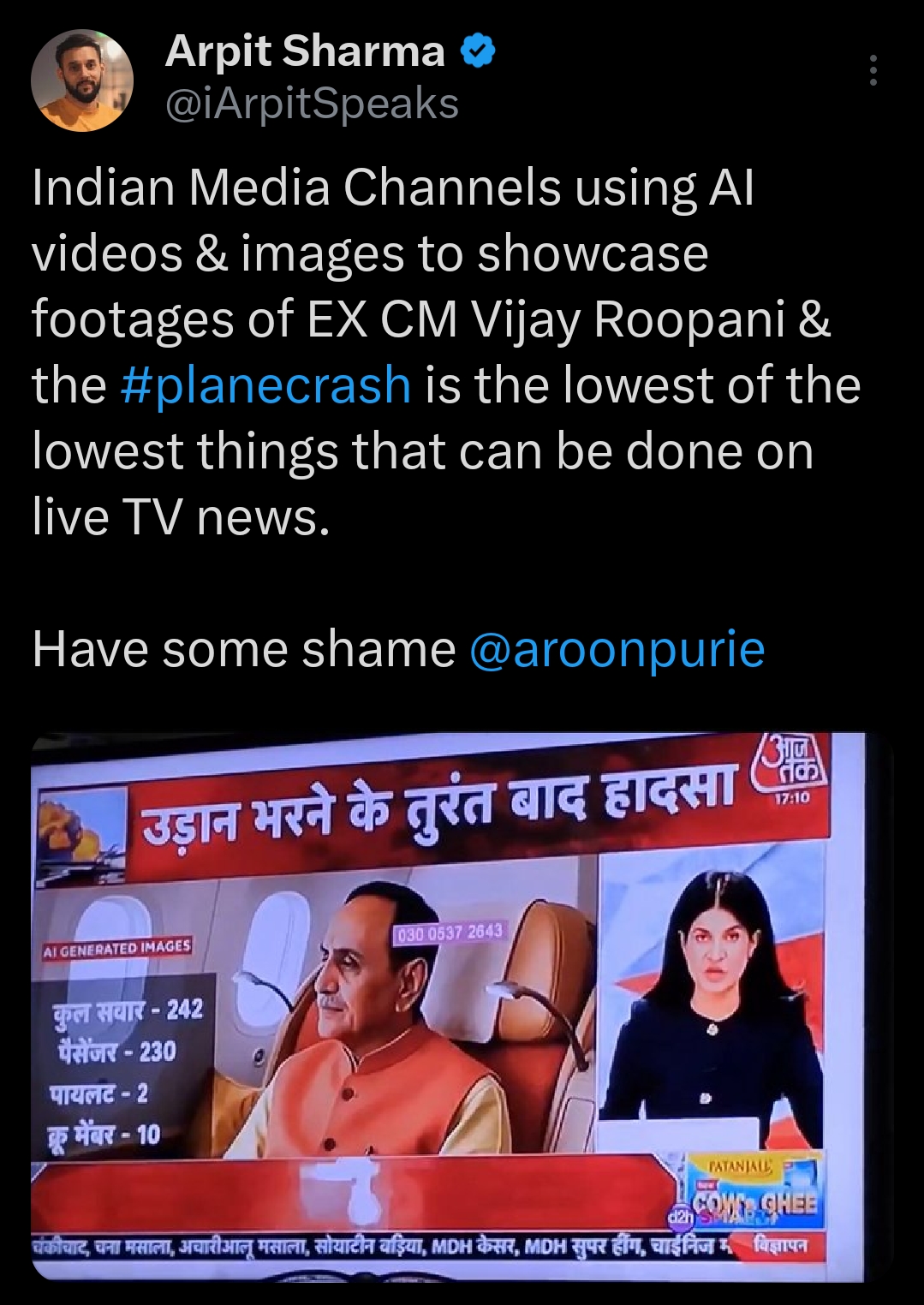 AI misuse this is. Using AI-generated footage of the victim in the Ahmedabad plane crash is exactly what NOT to do. Where’s the ethical use? Hope AI related startup founders are taking note of this.