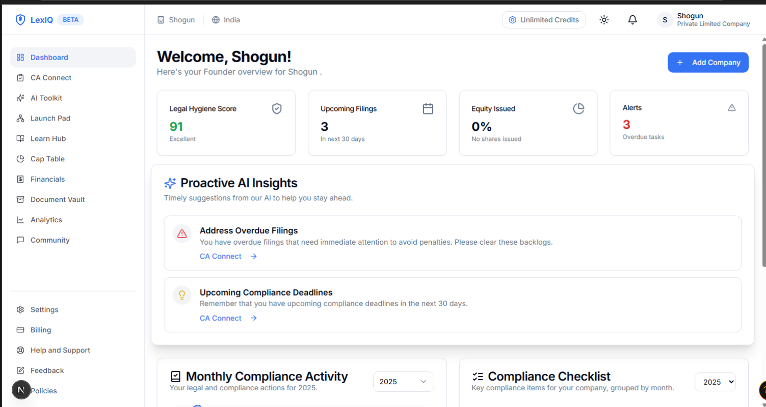 🔥 Early stage founders NEED this! 🚨 We’ve been quietly building something interesting: a smart compliance & legal assistant designed to simplify your entire legal, financial, and tax journey all in one sleek dashboard. Huge thanks to Niket Raj Dw