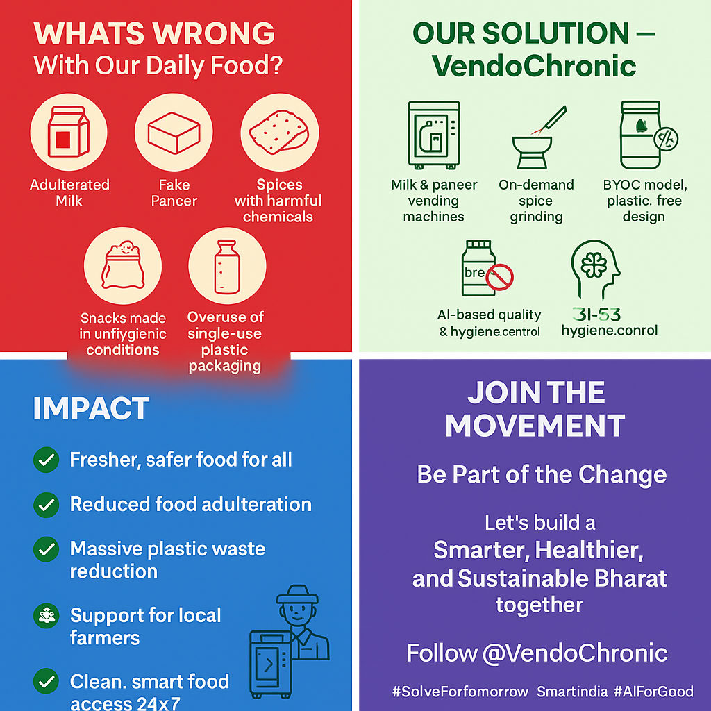 Title: “What We’re Building” 🥛 Milk & paneer vending machines 🌶️ On-demand spice grinding 🍞 Smart snack vending with air frying ♻️ BYOC model, plastic-free design 🤖 AI-based quality & hygiene control