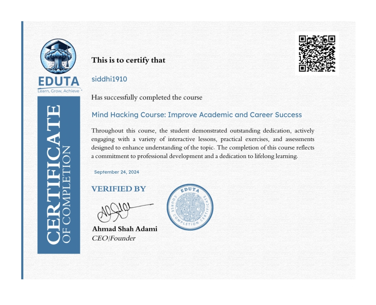 I’m happy to share that I’ve completed the Mind Hacking Course: Improve Academic and Career Success from Eduta! 🧠✨ This course has really helped me learn how to improve my focus and productivity. The lessons and activities were engaging and useful.