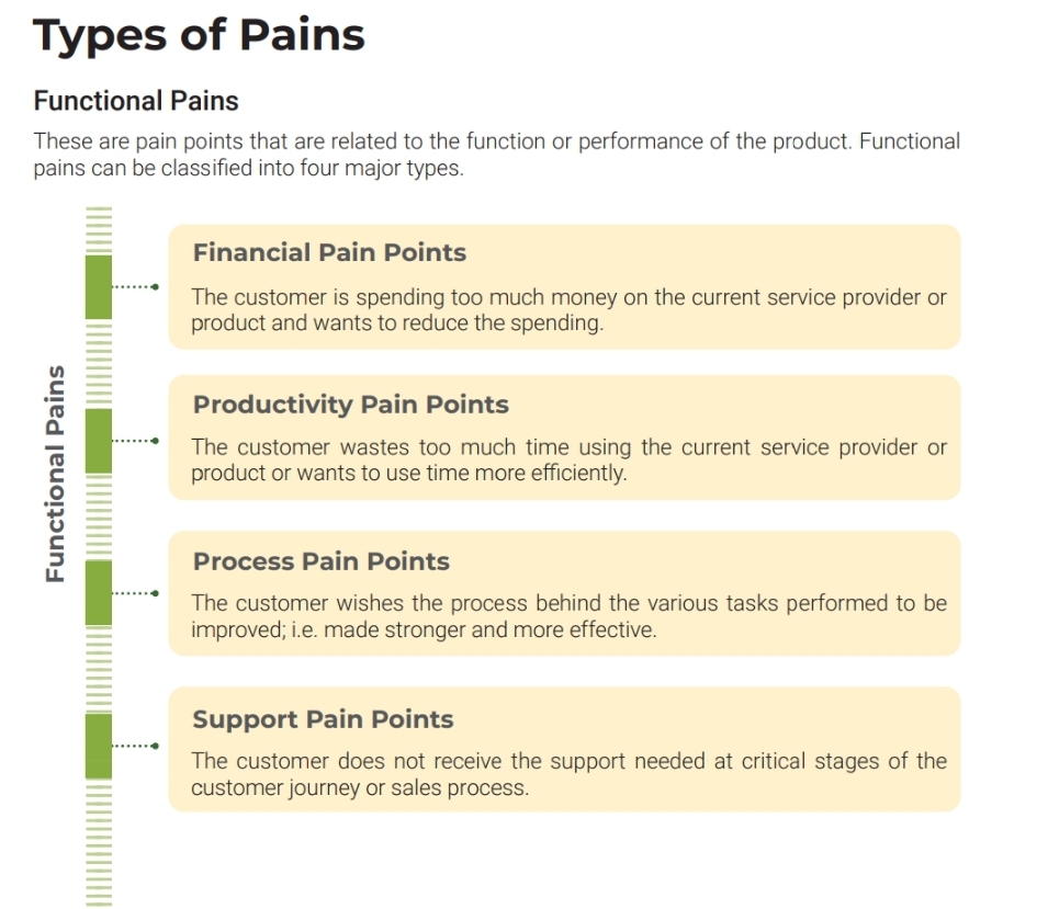 ⚠️ Types of Functional Pains in Customer Experience Customers face different challenges when using a product or service: 💰 Financial Pain – Too expensive, seeking cost reduction. ⏳ Productivity Pain – Wasting too much time, needing efficiency. 🔄