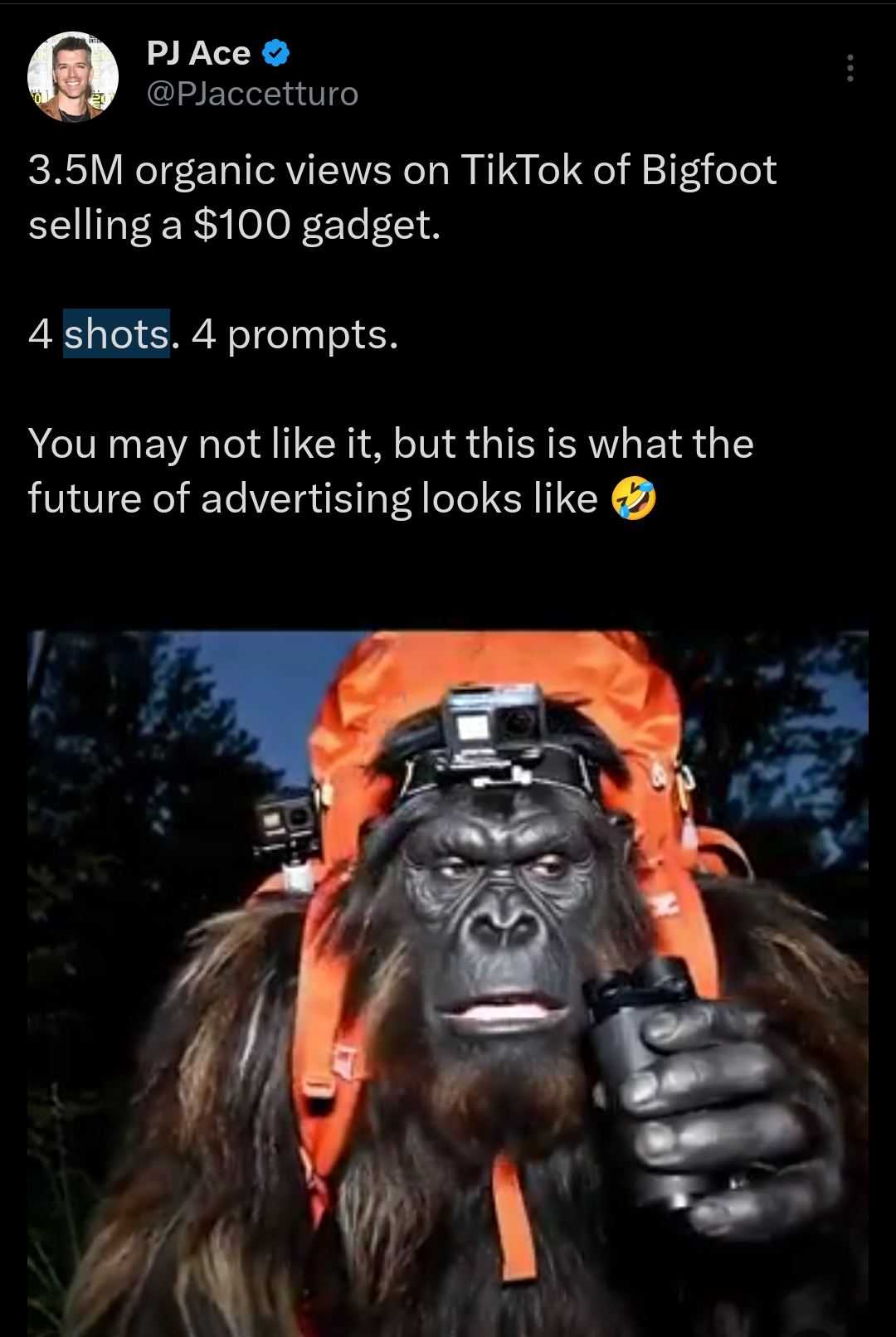 This is crazzy 🤣 Check it out! Ai is going too far. Really the future of advertising. If it goes right to Ai, you'll get such creativity. Go & Check the full video to know what I'm talking about 😜. On PJ Ace's X