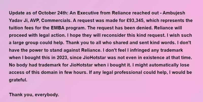 What do you think guys? Reliance could have funded this guy's fee and gained huge goodwill and PR. But instead they proceeded with legal action. The possible reasoning for this would be that it might become a common way to make money similar to Cyb