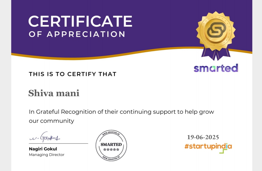 Thrilled to be recognized by Smarted with this Certificate of Appreciation for my continued support in helping grow our community. It's rewarding to see the impact of collective efforts! #communitybuilding #collaboration #Smarted #startupindia
