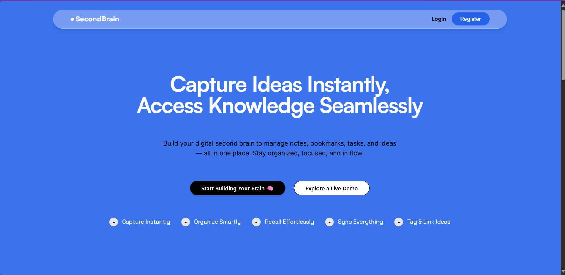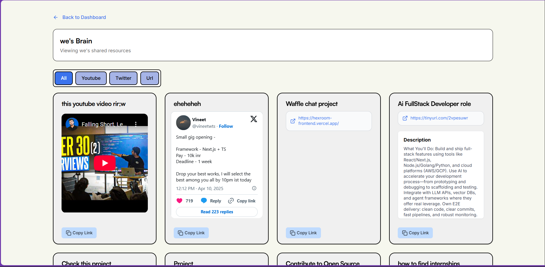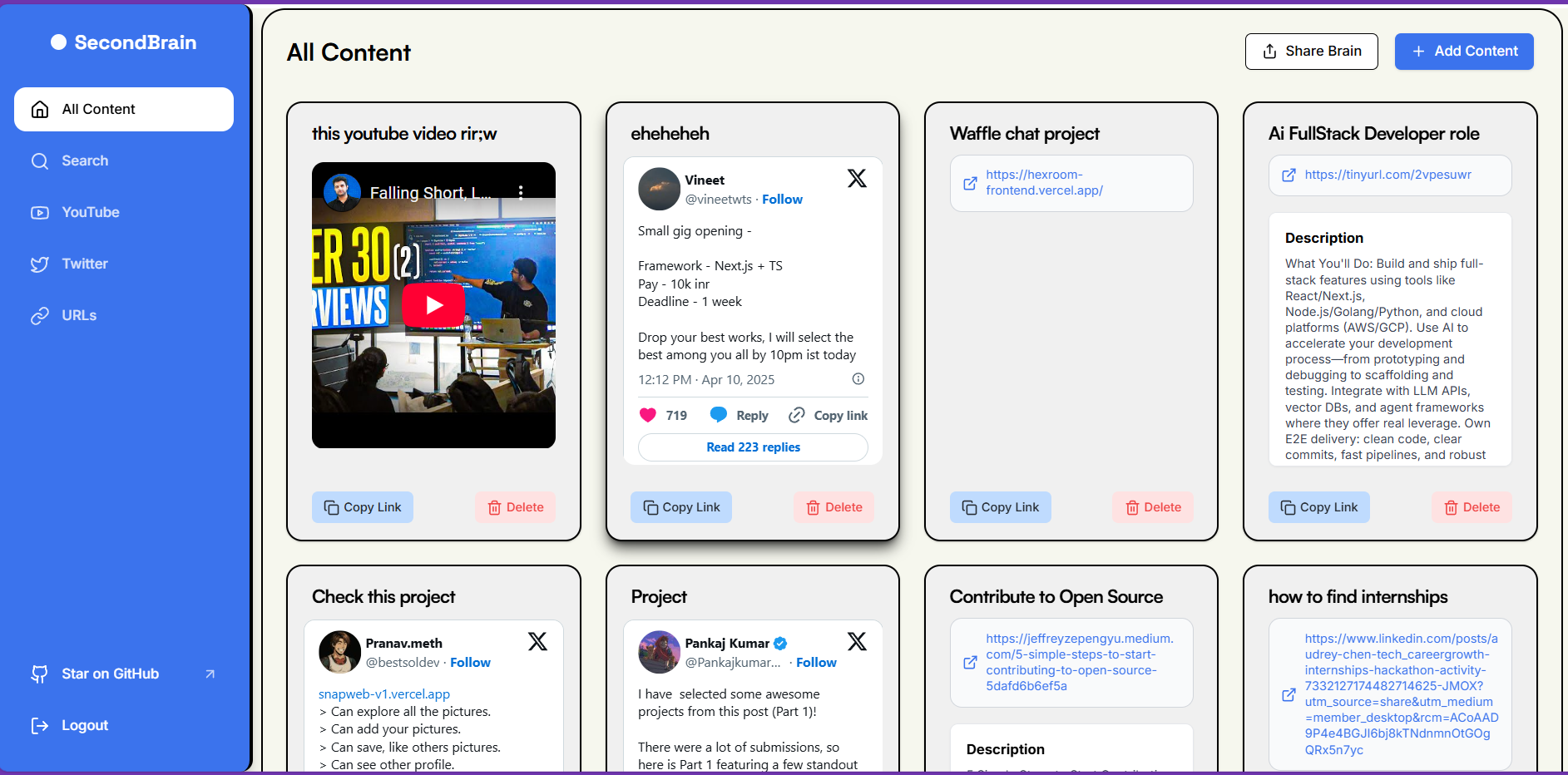 โจ Just launched Second Brain - My Personal Braindump How it works: 1๏ธโฃ Drop a link (YouTube, Tweet, URL) 2๏ธโฃ Preview, save & revisit. ๐พ 3๏ธโฃ Share & collab ๐ค Try it ๐ https://shared-brain-73dn.vercel.app Here's the GitHub link to the project: http