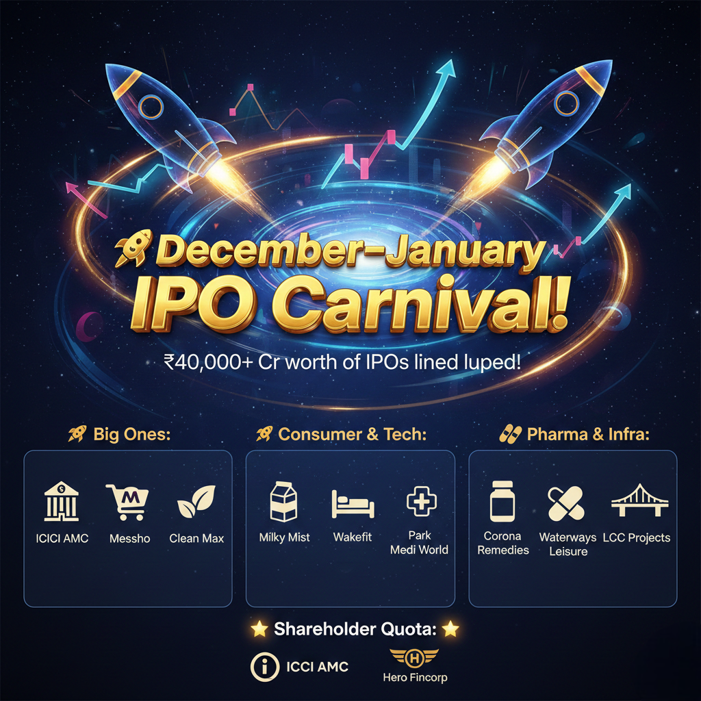 December–January IPO Carnival is HERE! More than ₹40,000+ Cr worth of IPOs are gearing up to hit the market! 📈✨ From ICICI AMC, Messho, Clean Max to Milky Mist, Wakefit, Corona Remedies, Waterways Leisure & more — this season is going to be BIG! �