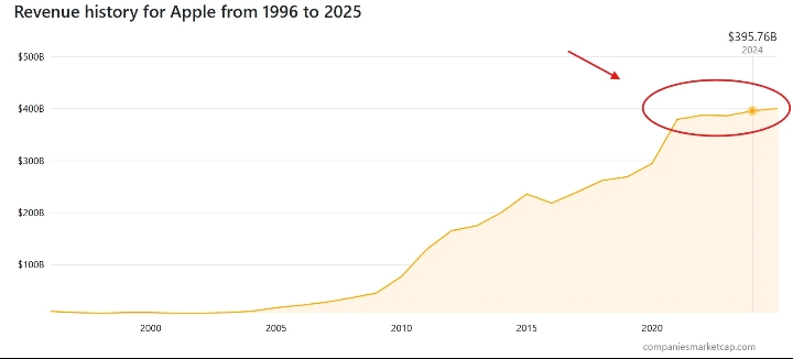 Apple’s revenue over the last few years: 2020: $294.1B 2021: $378.32B 2022: $387.54B 2023: $385.71B 2024: $395.76B 2025: $400B (projected) Do you see the same thing I see?