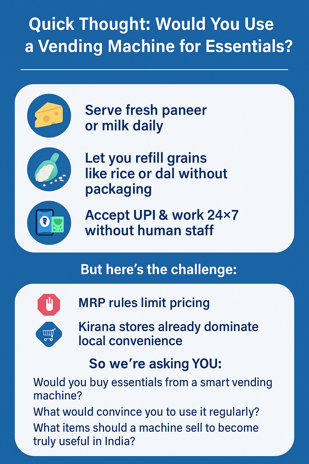 Would You Use a Vending Machine for Essentials? We’re curious… Imagine a vending machine that could: Serve fresh paneer or milk daily 🥛 Let you refill grains like rice or dal without packaging ♻️ Accept UPI & work 24×7 without human staff 💸 Re
