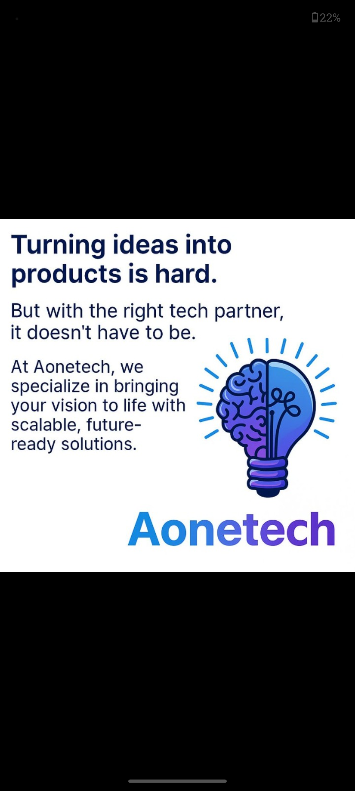 Turning ideas into products is hard. But with the right tech partner, it doesnโt have to be. At Aonetech, we donโt just build software โ we turn your vision into scalable, future-ready solutions. ๐ Whether you're a startup founder or scaling busin
