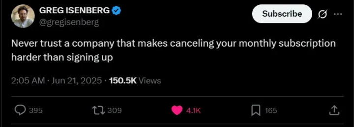 If your customer has to contact you to cancel their subscriptions, youโre doing it wrong. It just makes the experience bad. You better make it as easy as signing up for an accountโsmooth and effortless.