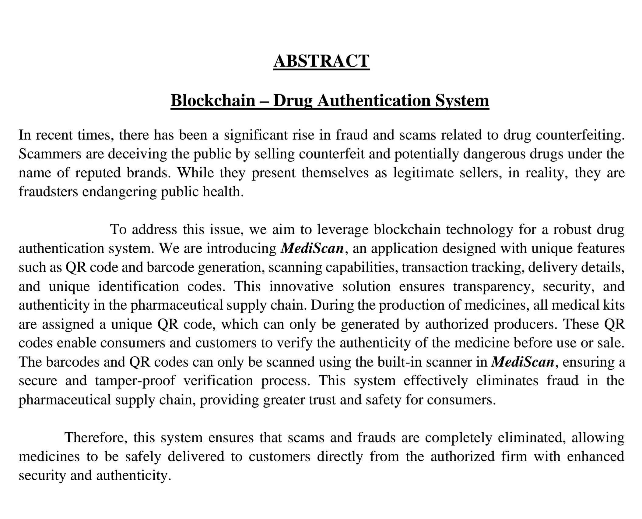 Project โ Blockchain-Based Drug Authentication System. During my 4th semester, I had the opportunity to work on a project aimed at reducing scams in the medical industry โ MediScan, a Blockchain-powered Drug Authentication System. Purpose: The pr