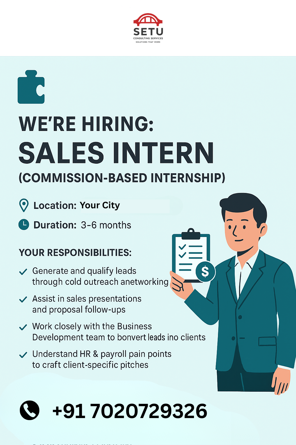 We're Hiring: Sales Intern (Commission-Based Internship) 📍 Location: Pune | 🕒 Duration: 3–6 months 📅 Start Date: ASAP | 💼 Industry: HR Outsourcing & Payroll Management Are you a go-getter with a passion for B2B sales? Want to learn how to close deals and earn while you learn? At Setu Consulting Services, we help startups and businesses scale faster by managing what slows them down—hiring and payroll. Now, we’re looking for an intern to join our sales team and get real-world experience driving revenue. 🎯 Your Responsibilities: ✅ Generate and qualify leads through cold outreach and networking ✅ Assist in sales presentations and proposal follow-ups ✅ Work closely with the Business Development team to convert leads into clients ✅ Understand HR & payroll pain points and craft client-specific pitches 🚀 What’s in it for you? • 100% performance-based sales commission on every converted client • First-hand experience in India’s fast-evolving HRTech & B2B services landscape • Training & mentorship directly from industry professionals • Internship certificate + PPO opportunity for high performers • Learn how to sell critical services to decision-makers (CXOs, HR heads, Admin leads) 👤 You are someone who: • Has strong communication & persuasion skills • Is hungry to learn, and even hungrier to earn • Is ready to hustle, take ownership, and build a strong sales foundation • Prefers performance-based roles over fixed stipends 📩 Apply Now: share your interest in DM Tag a hustler, or DM us if you're ready to start your sales journey with impact. hashtag#SalesInternship hashtag#CommissionBased hashtag#HRTechSales hashtag#ManpowerOutsourcing hashtag#PayrollSolutions hashtag#B2BSales hashtag#StartupCareers hashtag#Internship2025 hashtag#SalesOpportunity hashtag#JoinOurTeam hashtag#HiringNow hashtag#PerformanceBasedRoles