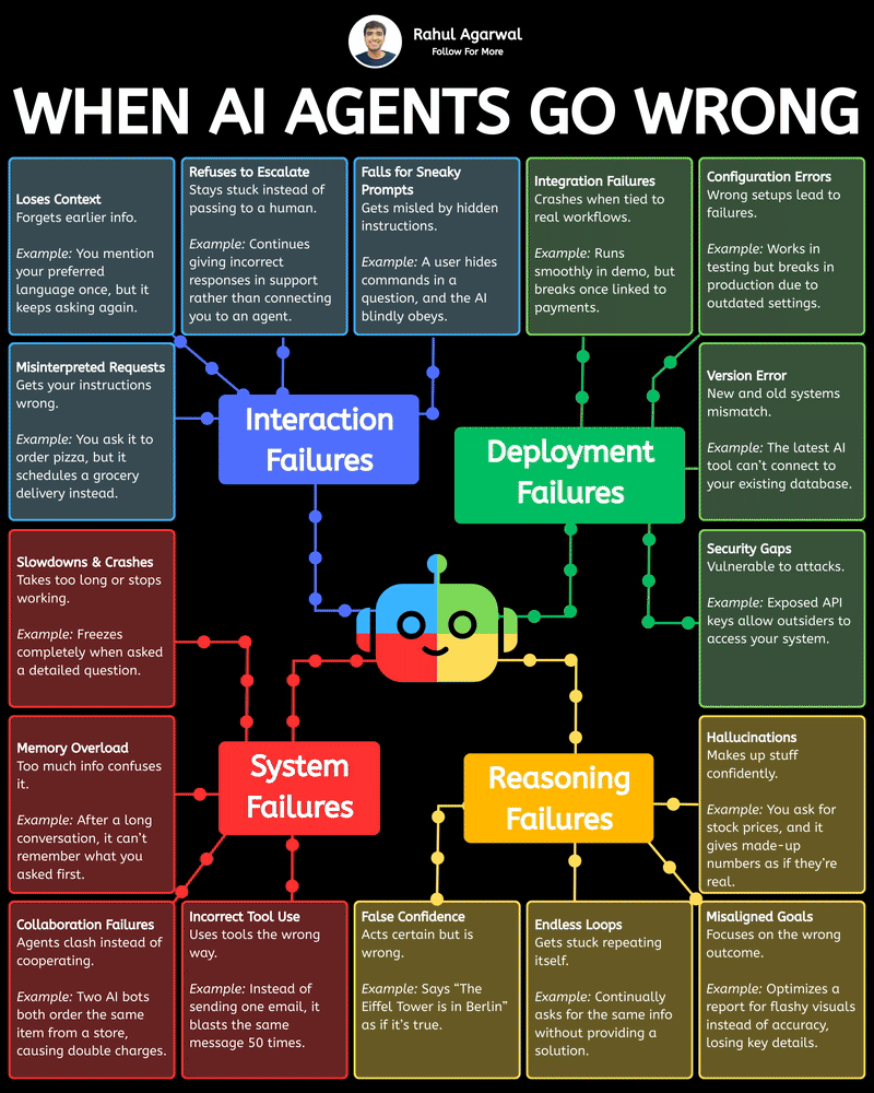 Enough talking about the benefits of AI. But when all does AI go wrong? Letโs take a look at some of the key ways AI can fail: 1๏ธโฃ ๐ฅ๐ฒ๐ฎ๐๐ผ๐ป๐ถ๐ป๐ด ๐๐ฎ๐ถ๐น๐๐ฟ๐ฒ๐ โข ๐ ๐ฎ๐ธ๐ฒ๐ ๐๐ฝ ๐ถ๐ป๐ณ๐ผ๐ฟ๐บ๐ฎ๐๐ถ๐ผ๐ป confidently. โข Focuses on the ๐๐ฟ๐ผ๐ป๏ฟฝ