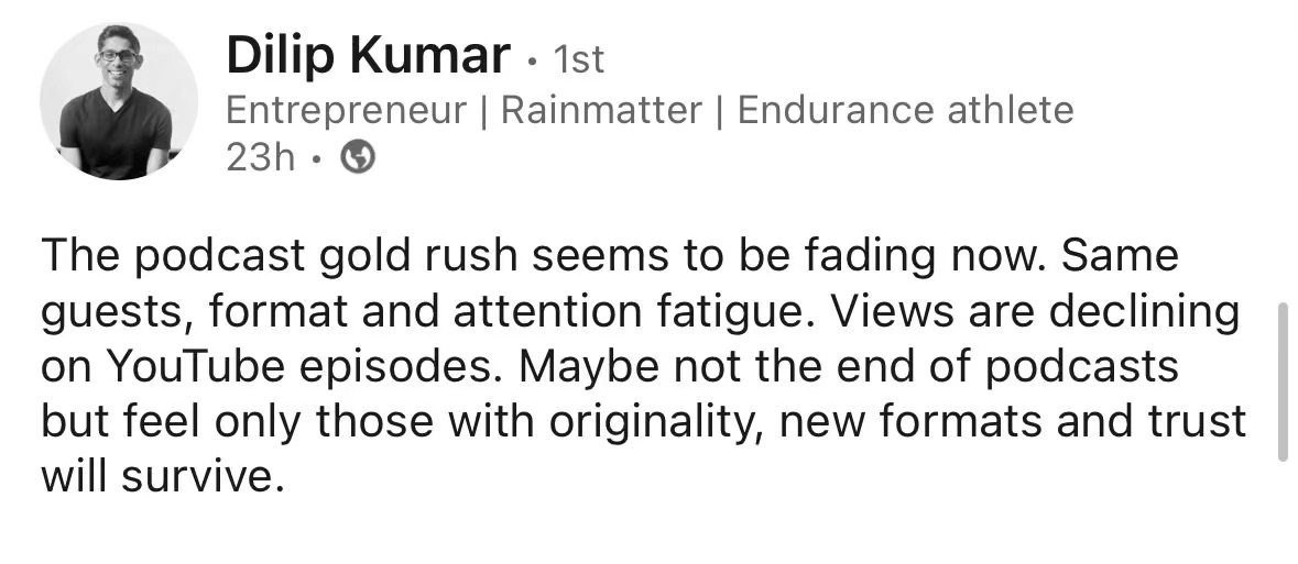 Are podcasts the new PR billboards? Or have we just lost the plot? As someone who genuinely enjoys long-form content, podcasts have helped me stay curious and focused in a world obsessed with 10-second reels. But yes, the noise is real. Every founder is on every podcast. Same story, same funding round, same talking points. Some even use it to whitewash narratives while their companies struggle and customers are left unheard. Others push movie promos instead of value. But then you listen to a Think School or Indian Silicon Valley episode, and you’re reminded, this is what podcasts can be. Raw insights, real stories, deep thinking. We don’t need more mics. We need more meaning. Let’s bring podcasts back to what they were meant to be: a source of clarity, not clutter. Some of my favourites: Raj Shamani’s Figuring Out, Think School by Ganesh, Jivraj’s Indian Silicon Valley, Backstage with Millionaires, The Barbershop, WTF by Nikhil Kamath. Which ones do you still listen to?