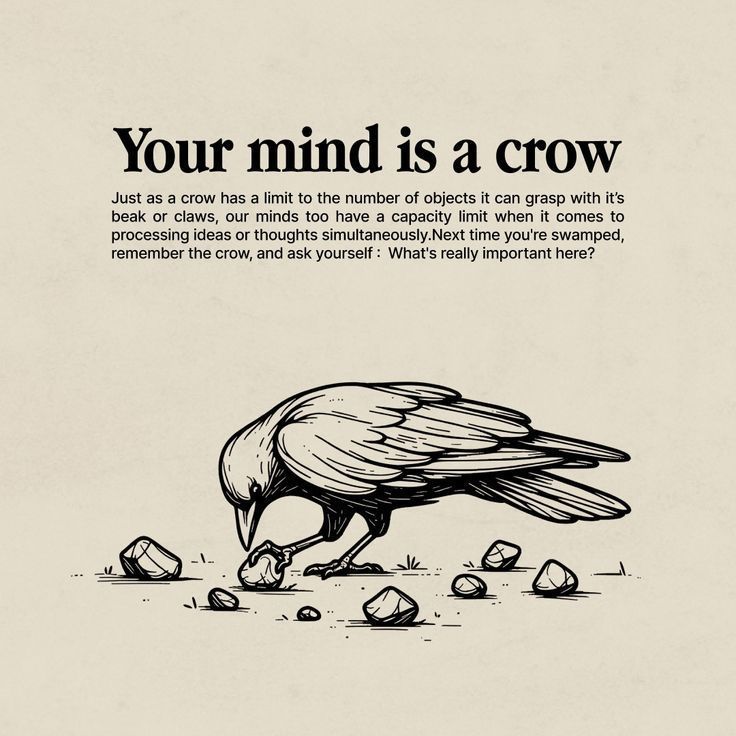 🧠 Your Mind is a Crow – Short Summary 1. Limited Capacity: Like a crow can carry only a few objects in its beak, your mind can only handle a few thoughts or tasks at a time. 2. Avoid Overload: Trying to think about too many things at once leads to stress, confusion, and poor decisions. 3. Focus on What Matters: Choose your top priorities and let go of distractions—just like a crow picking only the most useful stones. 4. Take Mental Breaks: Rest your brain often. Breaks improve clarity, memory, and energy. 5. Declutter Your Mind: Drop thoughts that don’t serve you—like worries, overthinking, and negativity. 6. Train Your Focus: Daily habits like writing to-do lists, limiting screen time, and journaling can sharpen your mental focus. 🧠 Example: You’re studying for an exam, but at the same time: You're thinking about a fight with a friend, 👉 That’s your “crow mind” trying to carry too many stones. Just like the crow drops some pebbles, your brain drops focus.